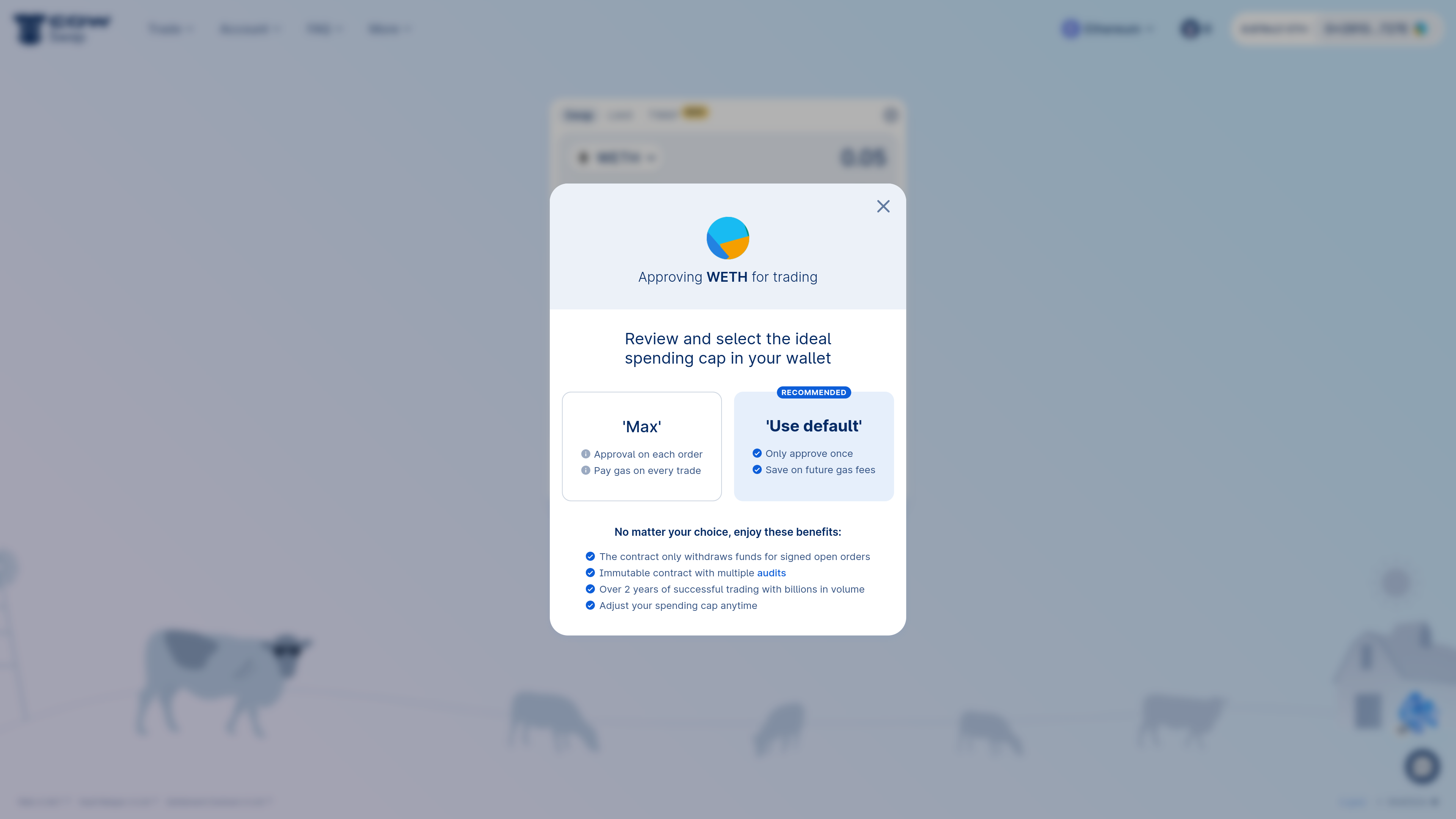 By default, CoW Swap prompts you to give vault relayer an "unlimited" allowance for the sell token.