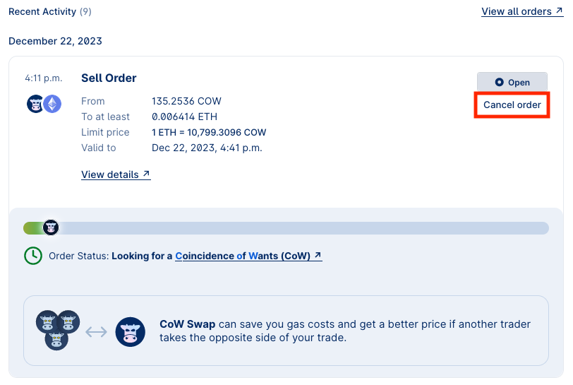 Changed your mind? Not a problem! CoW Swap makes it easy and gasless1 to cancel your order.