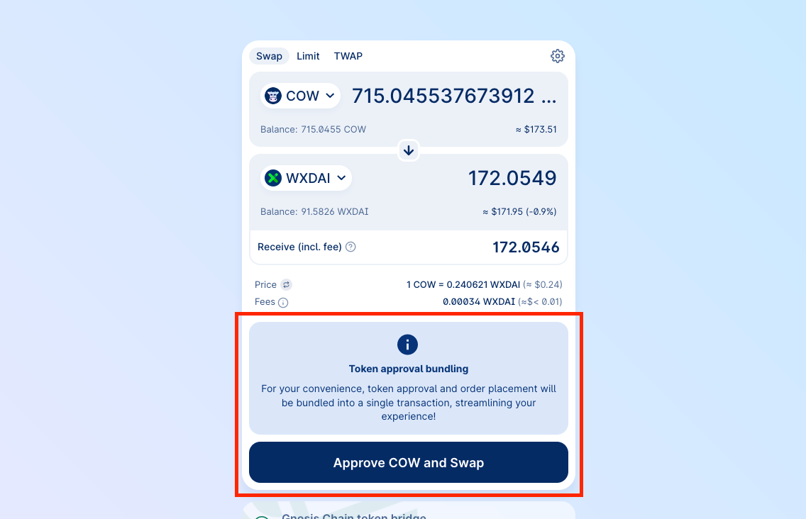 Some tokens, such as USDC, DAI, COW and many others support gasless approvals. This means that you can approve the vault relayer contract to spend your tokens without having any initial gas for an on-chain transaction. This is a great way to save on gas costs!